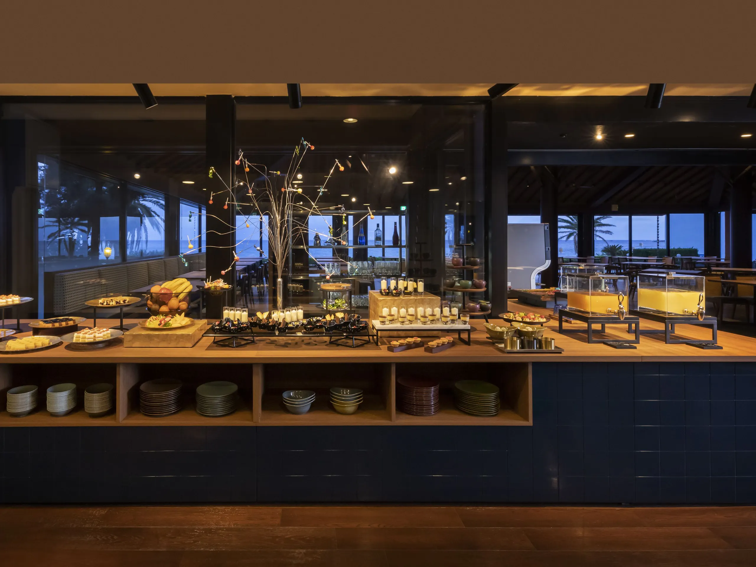 アトリウムに位置するレストランは、イルミネーションが煌めく華やかな空間で、夜の遊園地のような雰囲気も魅力です。夕食バイキングでは和洋中のメニューがそろい、パフォーマンスキッチンもあるため、味だけでなくライブ感も楽しめます。