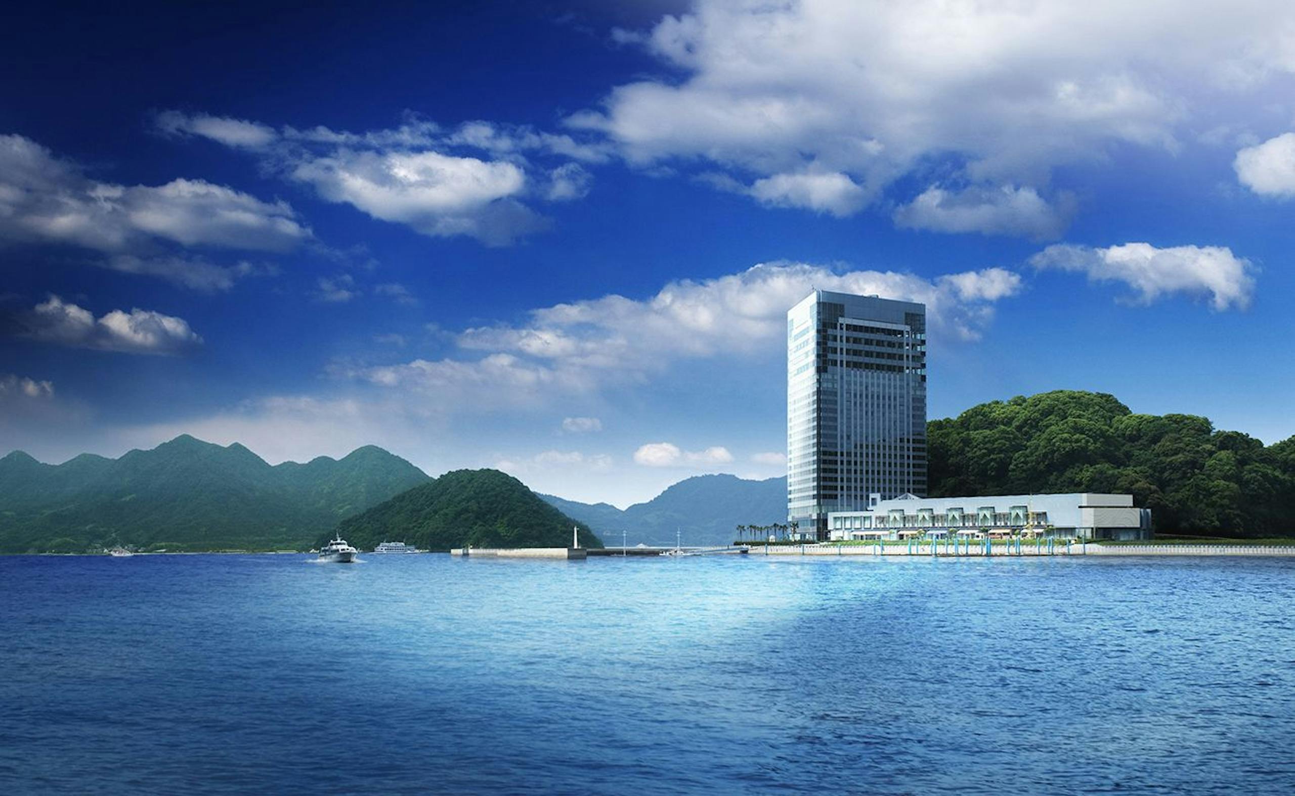 グランドプリンスホテル広島はJR広島駅から無料シャトルバスで約30分、宇品島の海沿いに佇んでます。