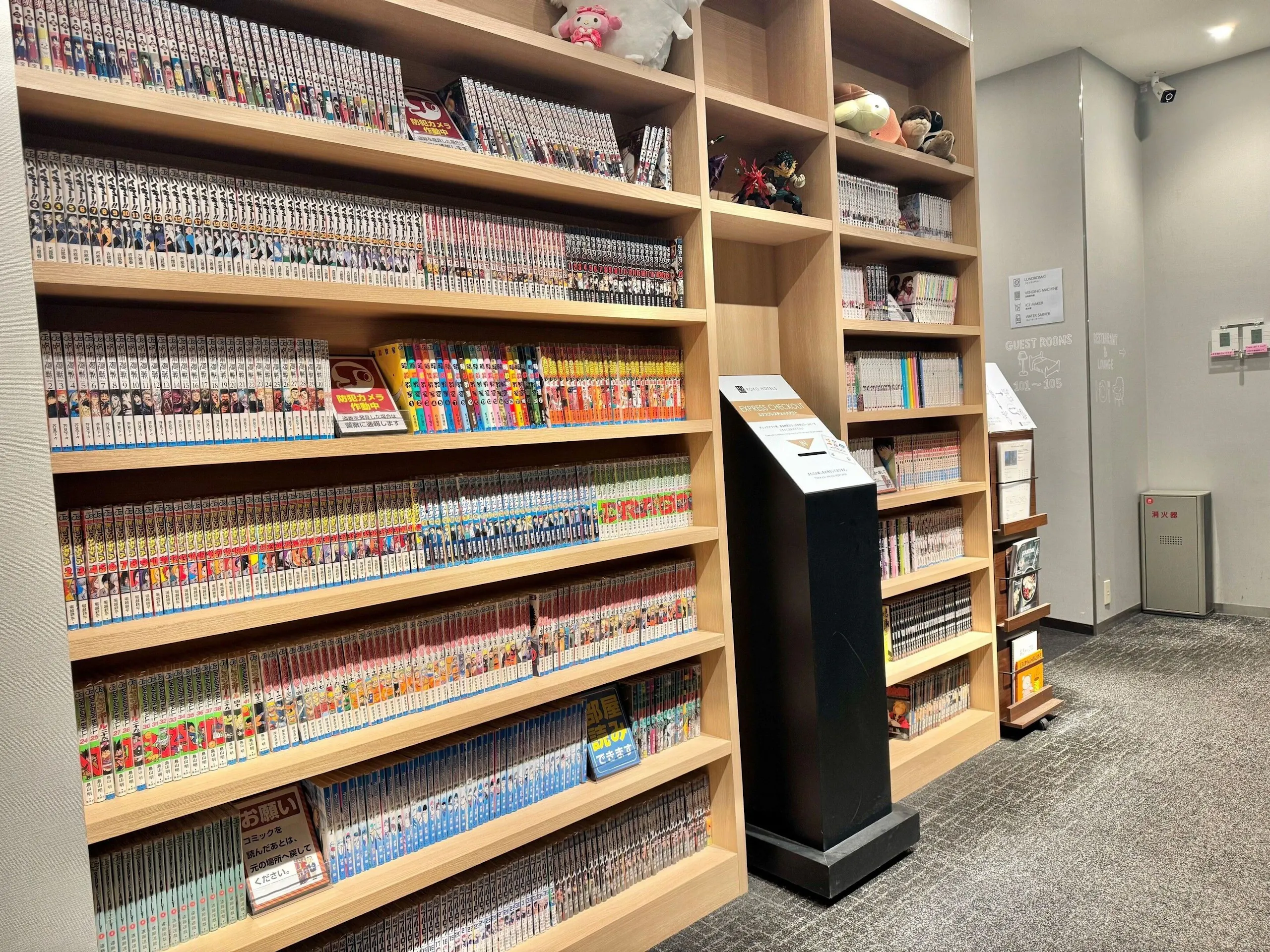 1階ラウンジスペースには無料のドリンクサーバーがあり、その横にコミックコーナーが設けられています。漫画の貸出も行われているため、観光後に部屋でのんびり読みたい方にも向いています。