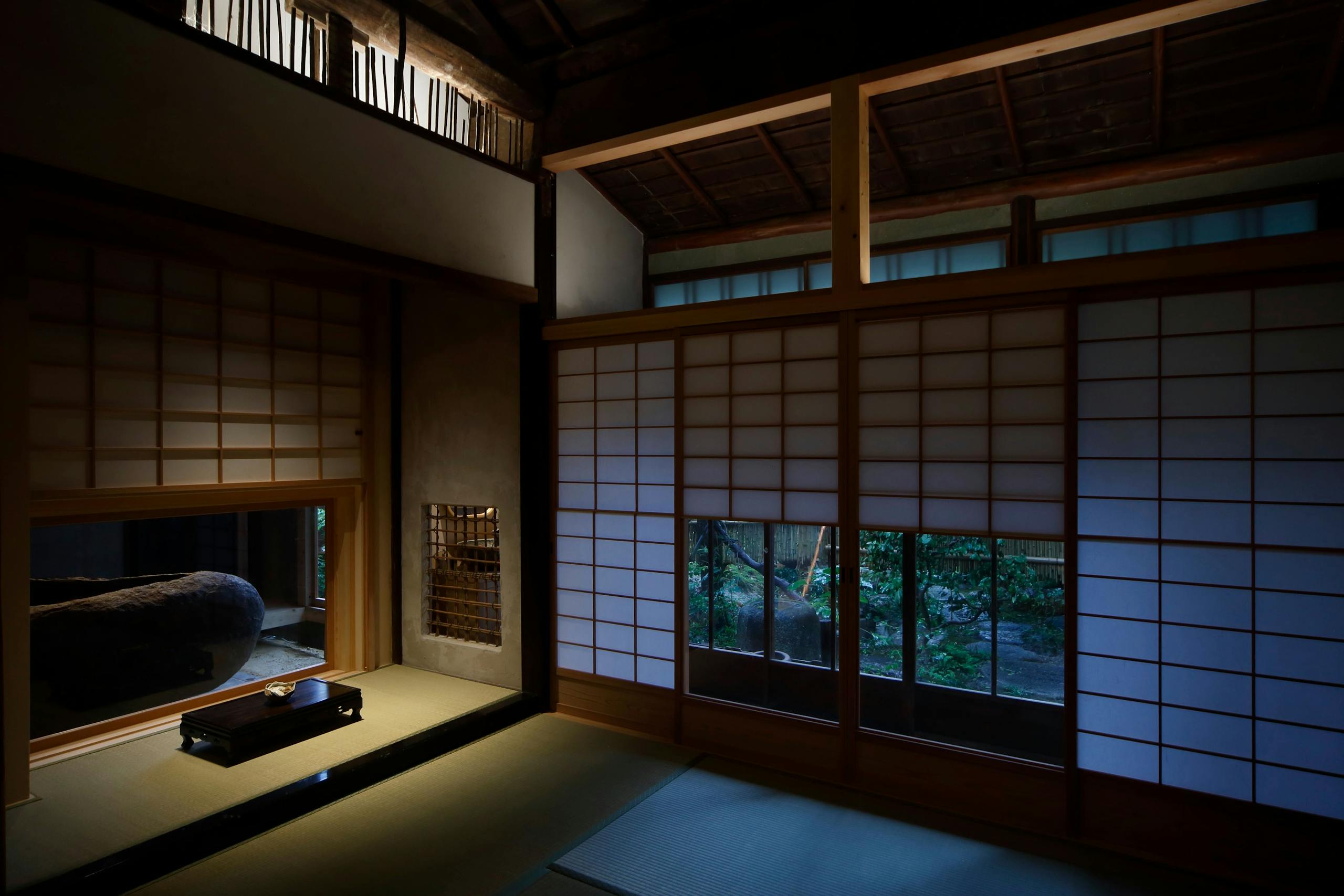 客室は窓から八幡掘りの水路を臨む数寄屋建築で木をテーマにした「旧喜多邸 離れ別邸【木の間】」と、梁や土壁が生かされ鞍馬石による岩風呂を設えた石がテーマの「鞍馬石岩風呂 特別室 【石の間】」の2室となります。