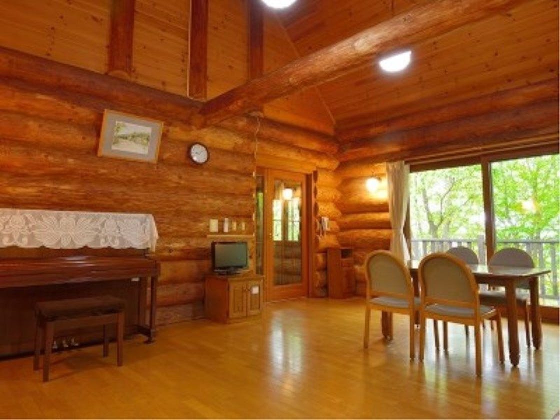 木の温もり溢れるカナダ産ログハウスのお部屋にヤマハのアップライトピアノがあるコテージとなり、大自然の中で弾くことができます。