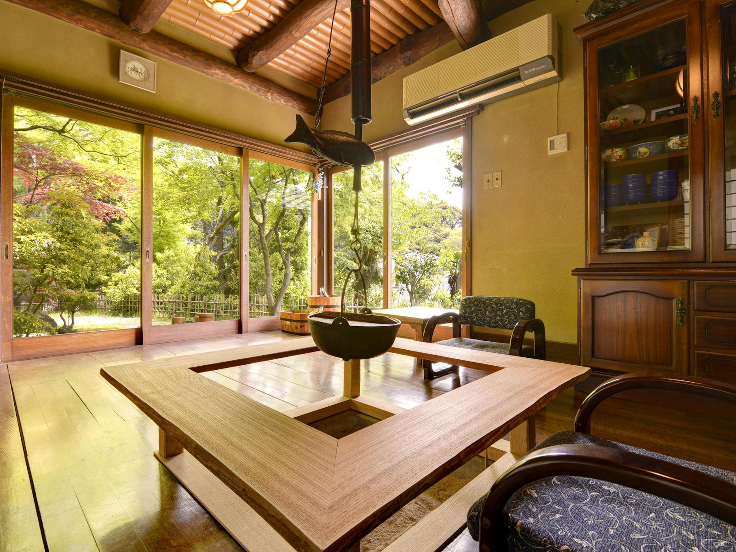 こちらは窓から木立を眺める囲炉裏のある宿となり、冬の季節にはコーヒーをいただいたりすることができます。