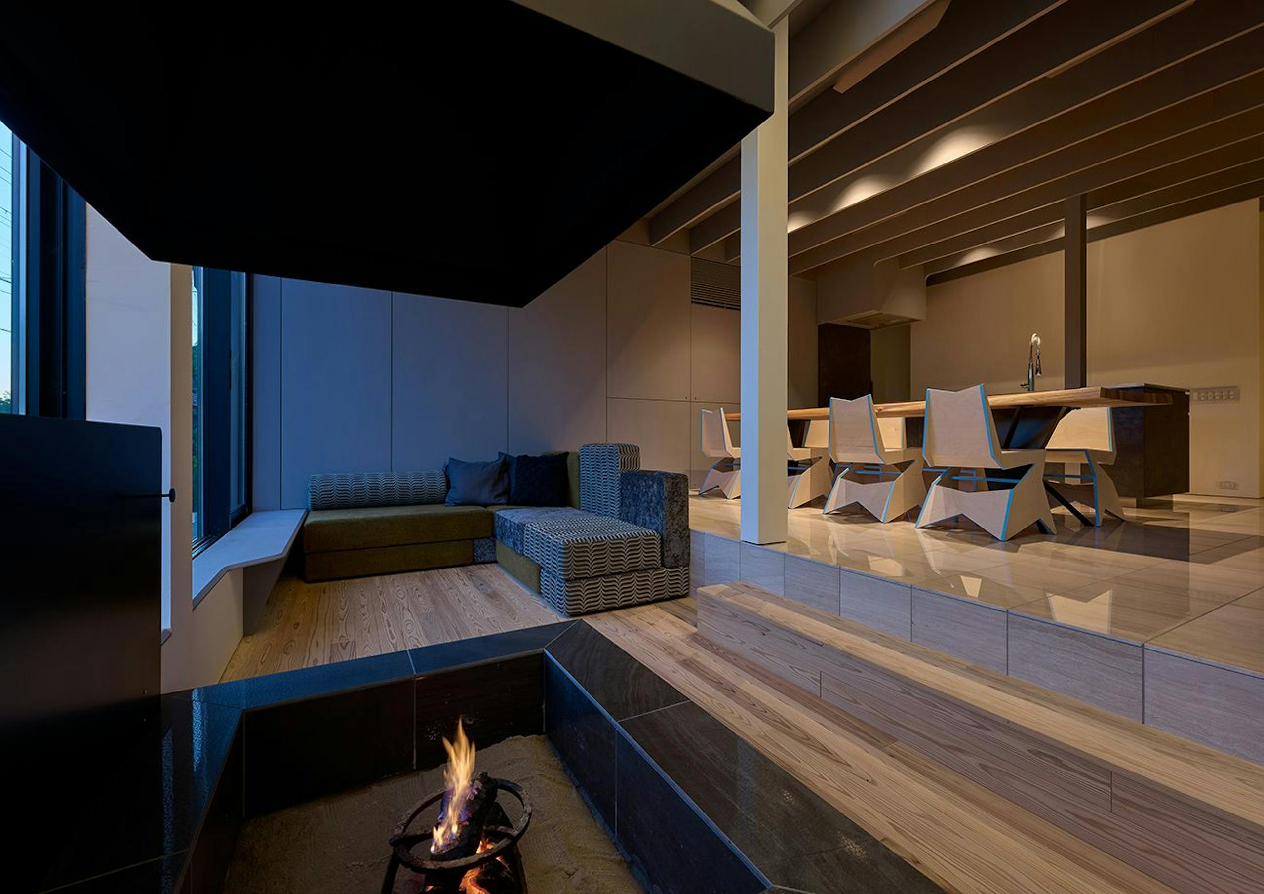 エントランスから館内に入ると和の趣をしたロビースペースに、囲炉裏のある宿となっています。