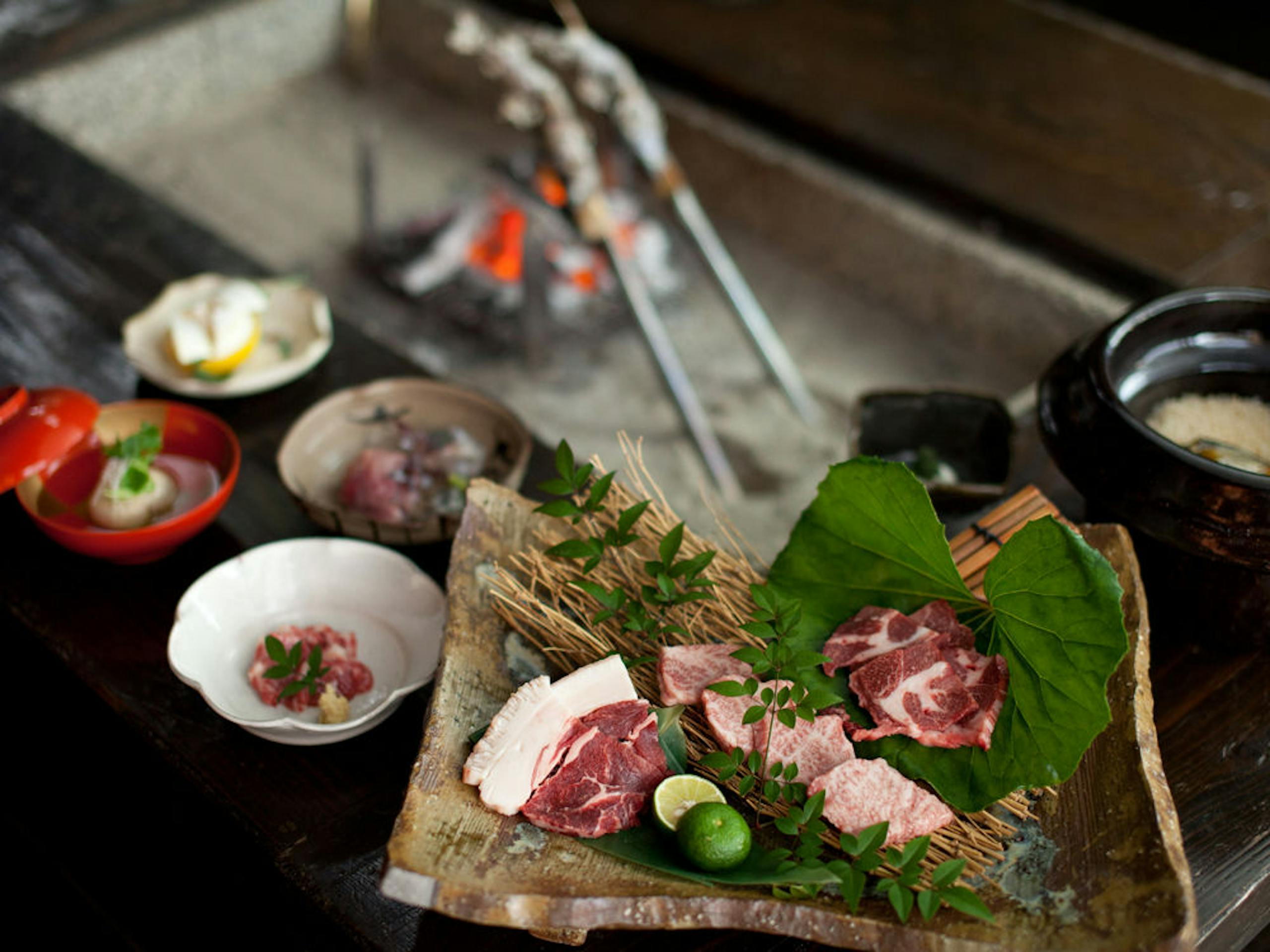 山女魚や宮崎牛などを炭火で焼いて食せるプランが用意され、囲炉裏で食事できる宿となっています。