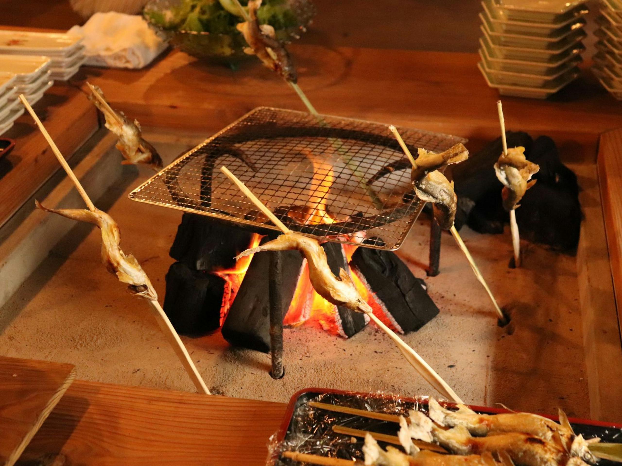 玄界灘の新鮮な魚介類など職人が丁寧に大きな囲炉裏にて、焼き上げて提供される「磯遊びプラン」が用意されてます。