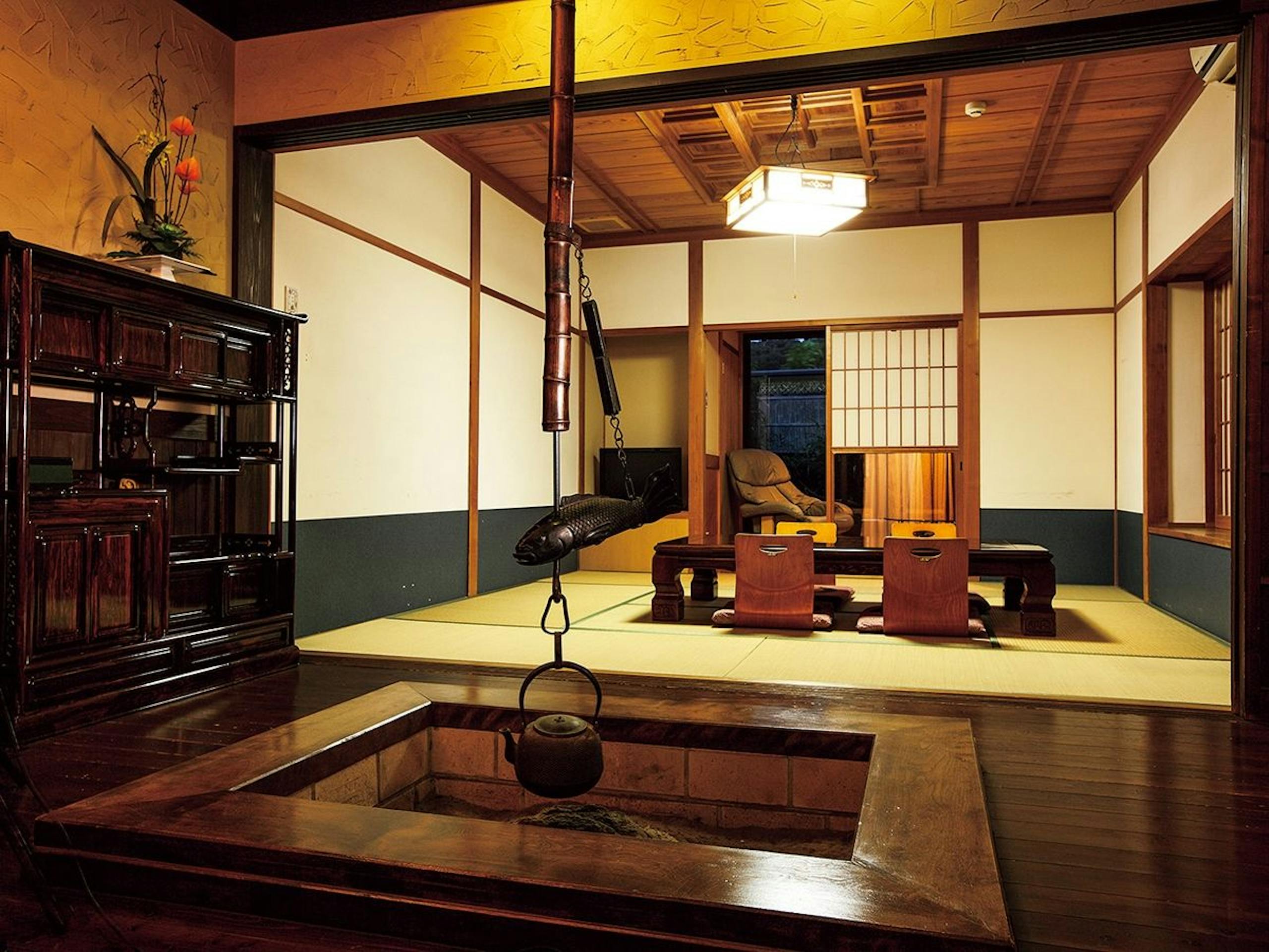 客室で「離れ 露天風呂付き和室」のお部屋に囲炉裏がある宿となり、懐かしい雰囲気となっています。
