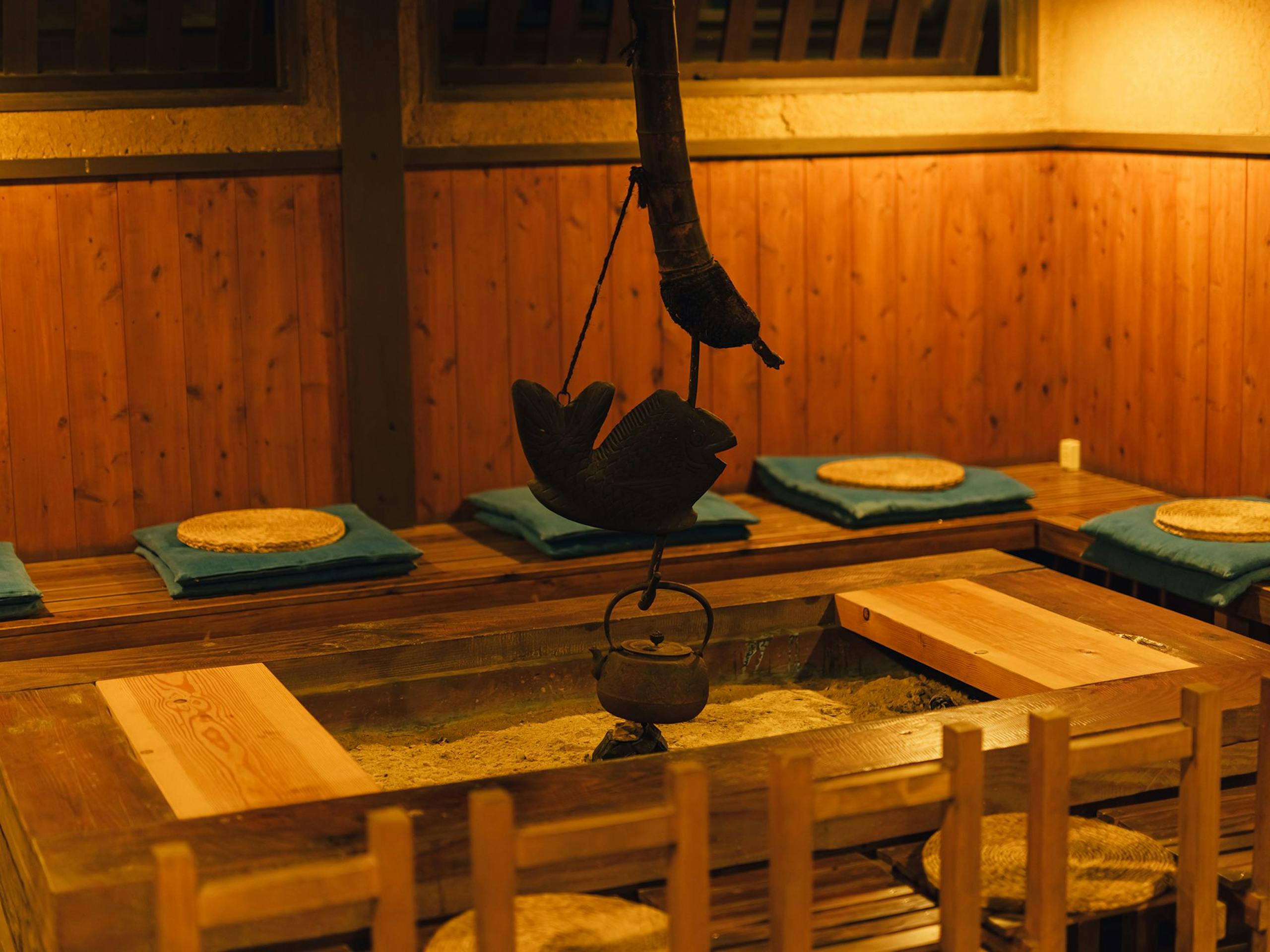 ※ 宿泊施設によって囲炉裏はロビーやお部屋などのインテリアとして設えたり、冬の季節以外には火が入っていないことなどあります。