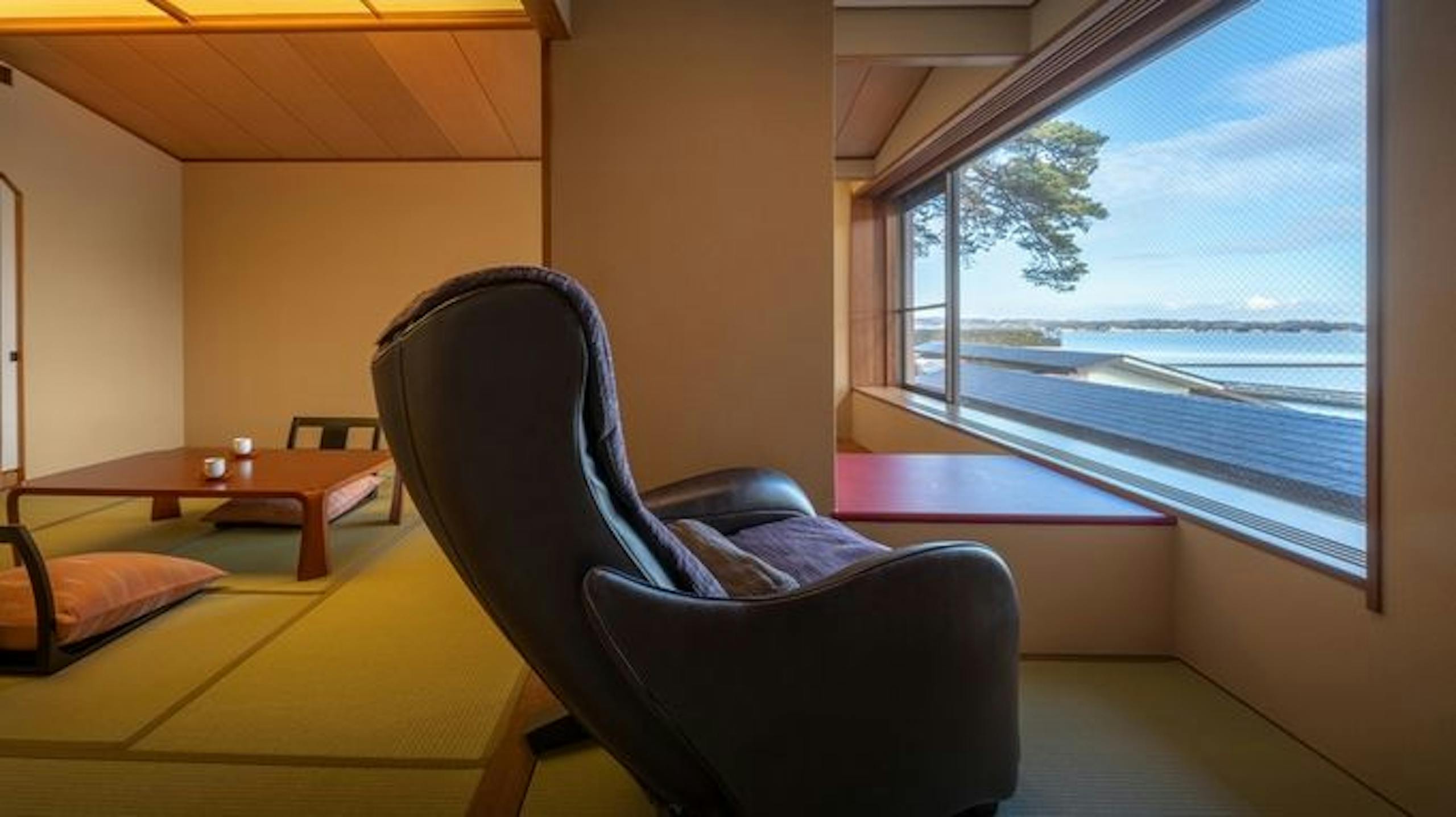 たとえば花筏のお部屋なら松島湾を眺めながらマッサージチェアでゆったりすることができ、ゆったり和スイートのお部屋なら広緑から松島の海を望むことができます。
