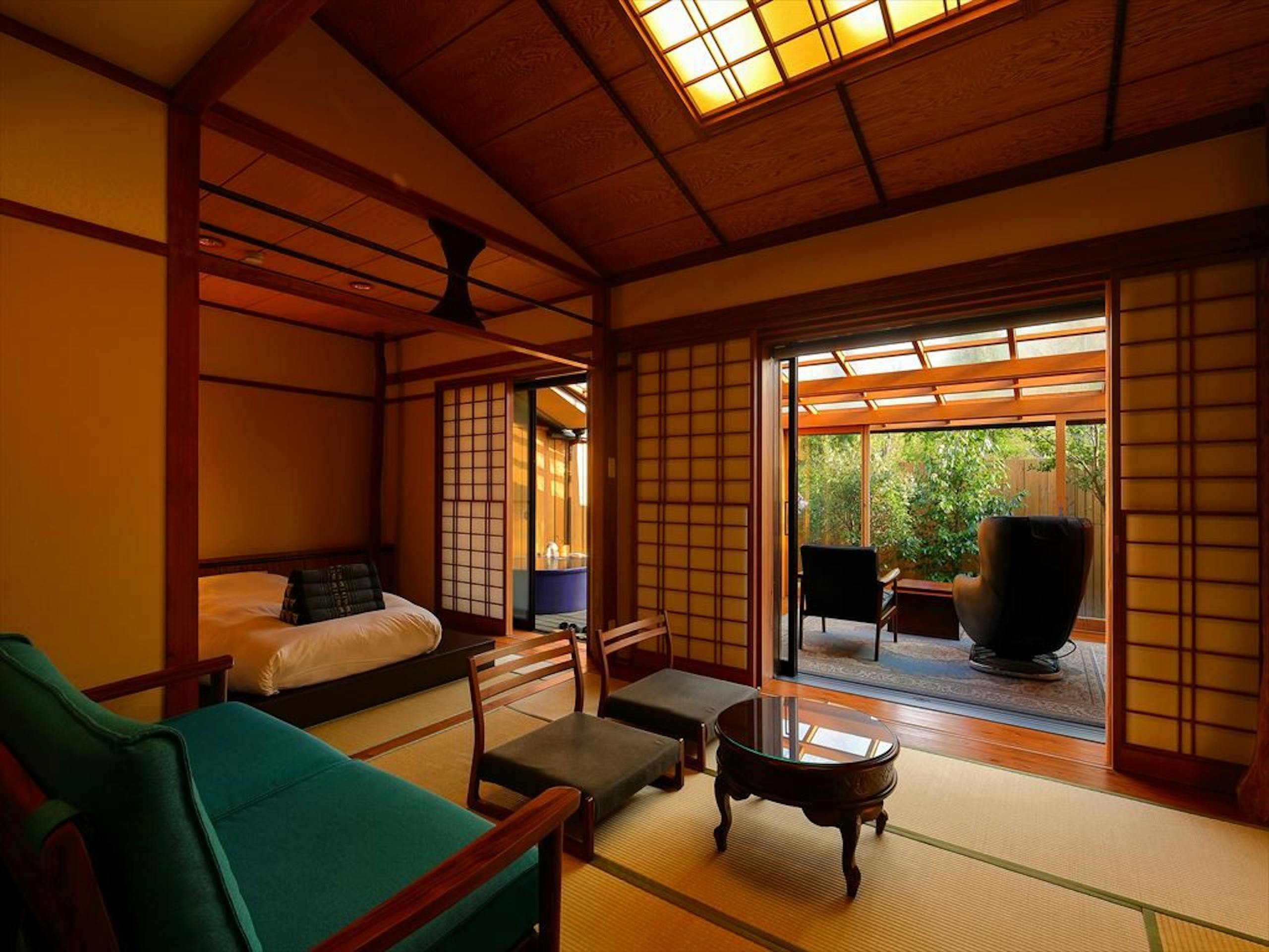 A Type 和室やB Type 和室、C-1Type 和室、C-2Type 和室のお部屋が、サンルームに設えたマッサージチェア付き客室となっています。