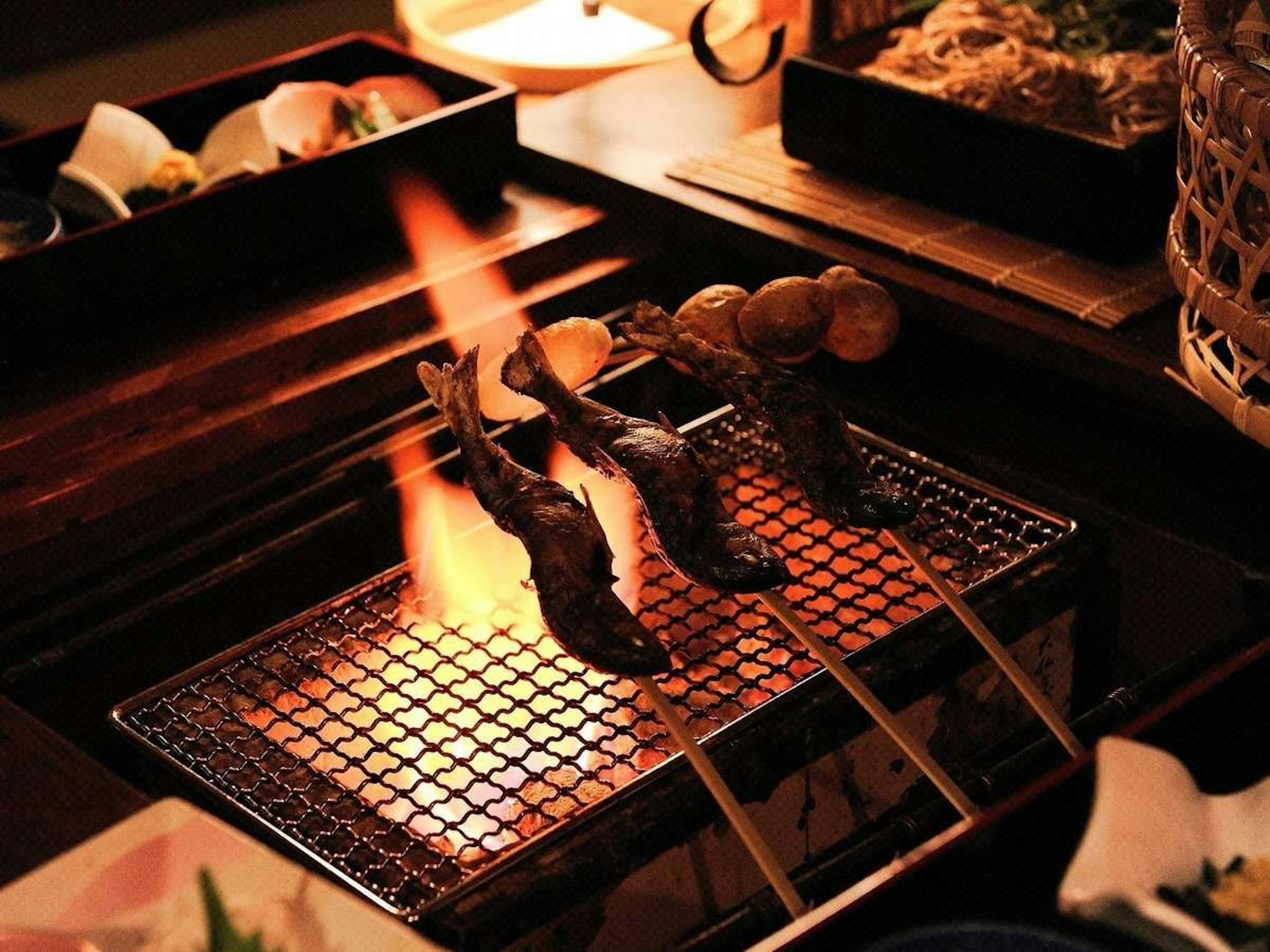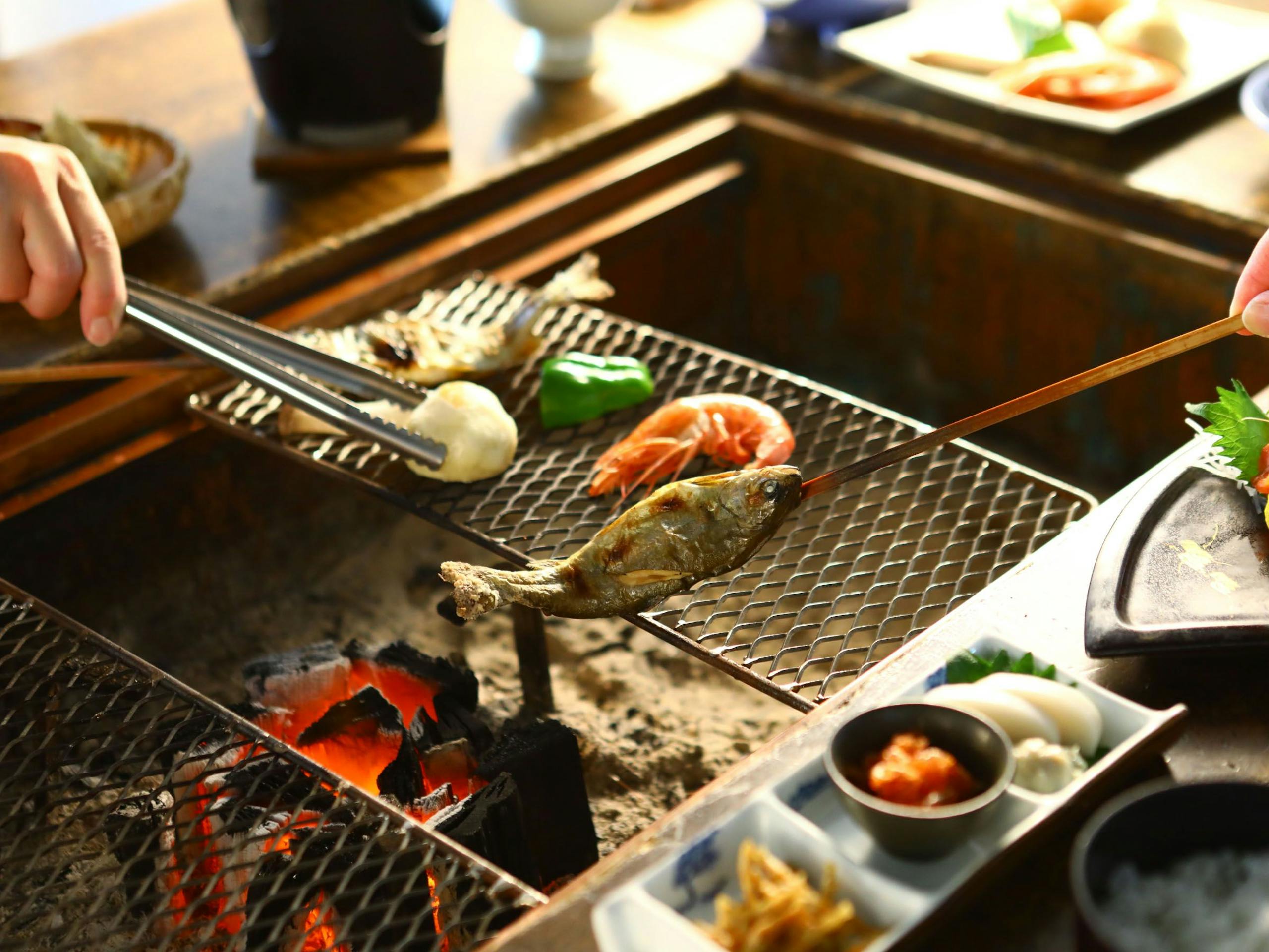 こちらでは夕食に囲炉裏を楽しめる会席料理など用意され、海鮮や川魚など焼いて食すことができます。