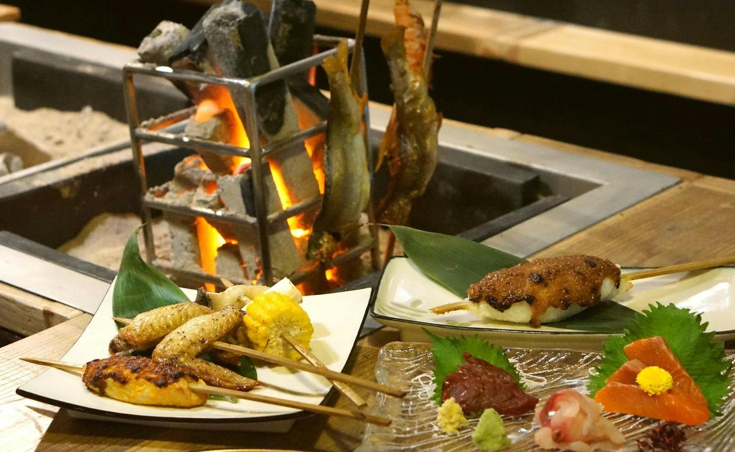 併設している馬肉料理店の「新三よし 浅間温泉いろりかこむ店」にて、コース料理内の串焼きを囲炉裏で温めて食すことができます。