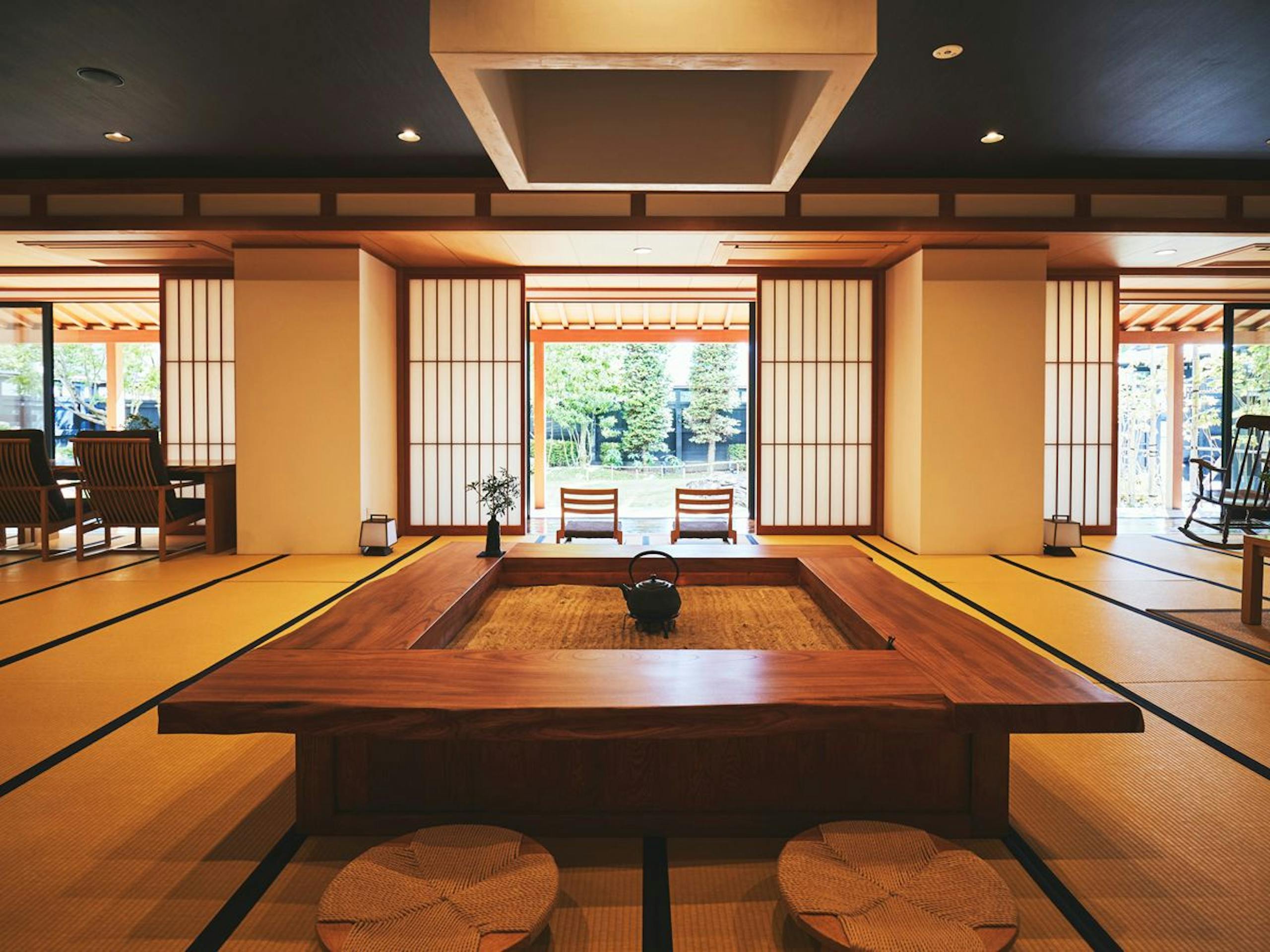宿泊棟1階のロビースペースで気楽に囲炉裏を囲んで過ごしたり、吹抜けの休み処で一枚板のテーブルによる囲炉裏などでゆっくりしたりできます。