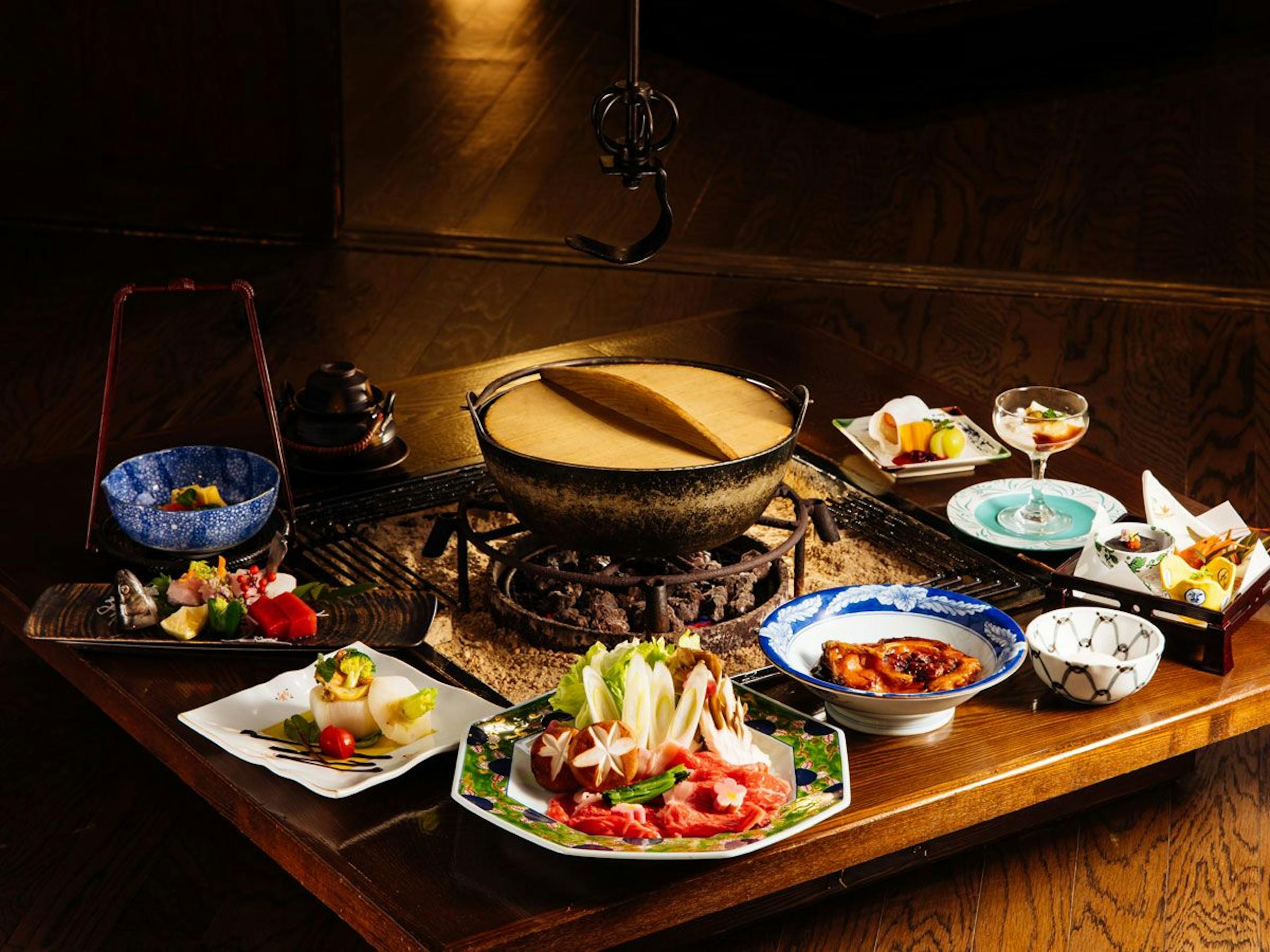食事処の個室料亭「山家庵いろりん亭」にて、月ごとに献立が変わる囲炉裏懐石料理を食すことができます。