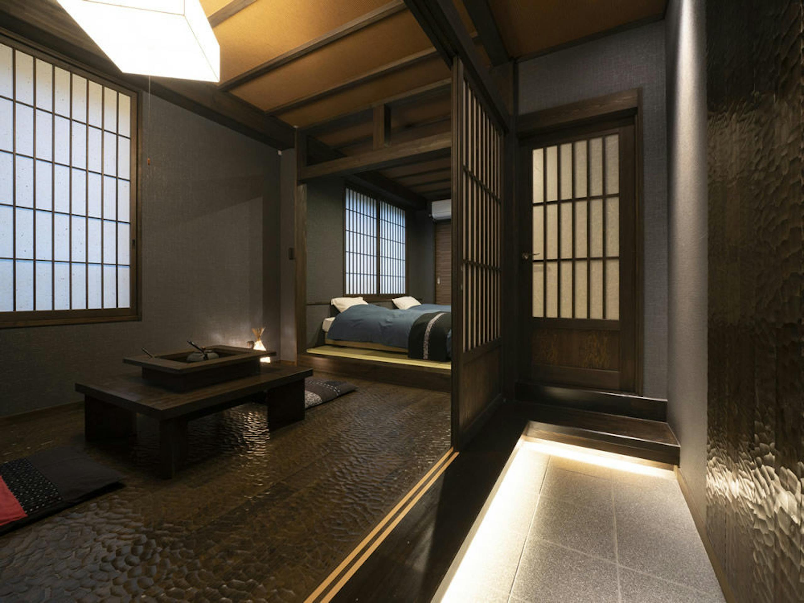 こちらの宿には和モダンな「癒しの飾り囲炉裏付き客室」があり、地下掘り式とテーブル式の2タイプが用意されてます。