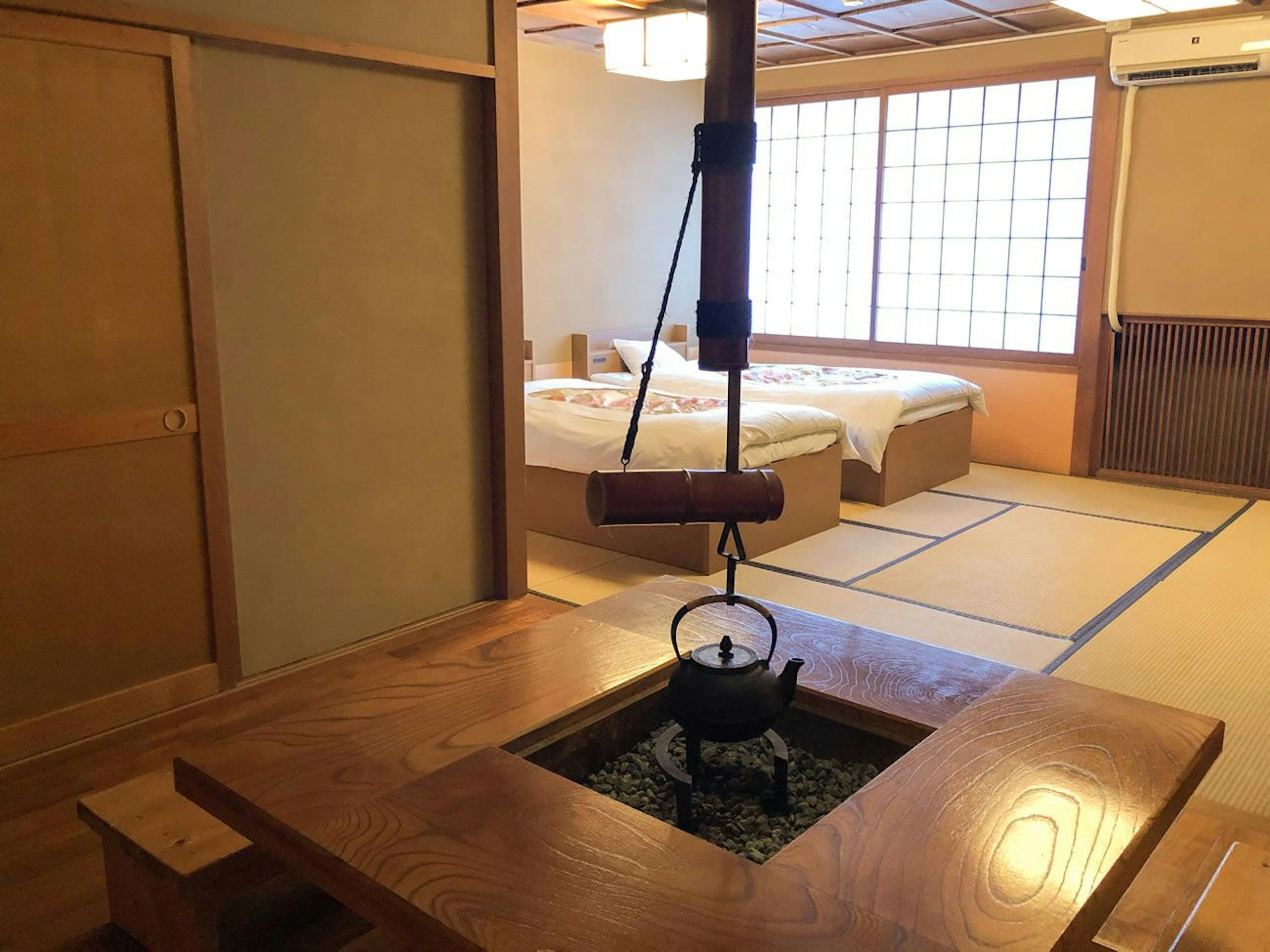 「囲炉裏ノ間 ゆき栗」の客室に囲炉裏を設え、ベッドを設置した和洋室のお部屋で過ごすことができます。