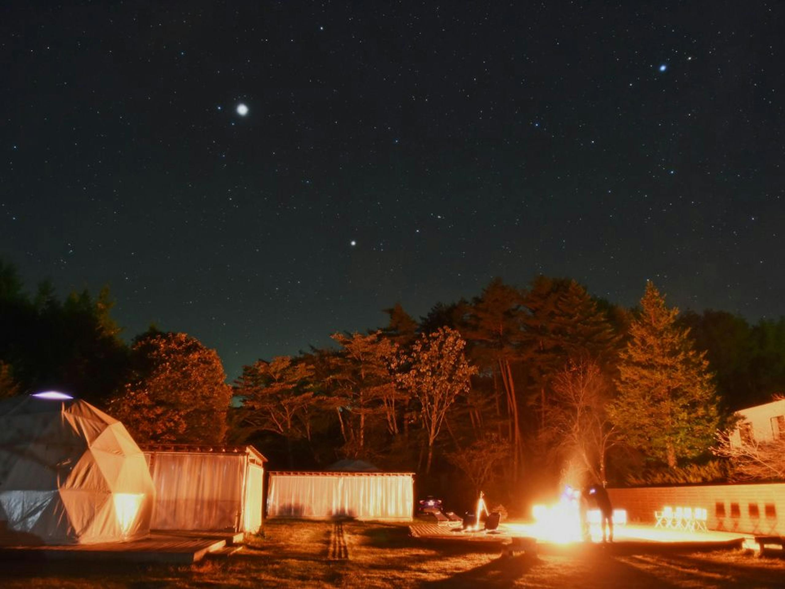 森のグランピング「フォレストドーム」の共用スペースでキャンプファイヤーが行われ、みんなで焚き火の炎を囲んだりすることができます。