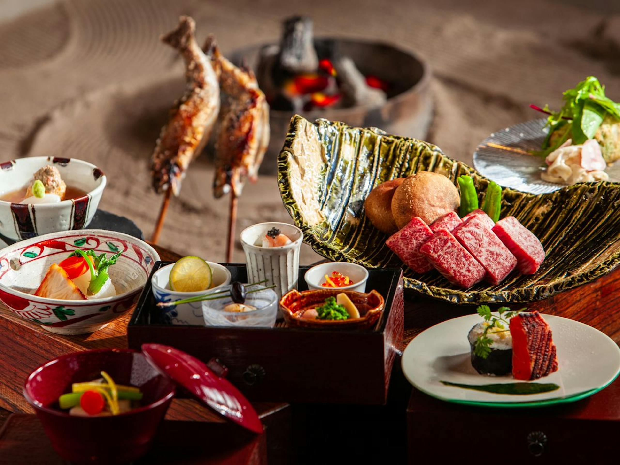 こちらでは食事を別棟で築約150年の豪農の古民家を移築した個室の山草庵にて、囲炉裏の炭火でじっくり焼き上げた川魚など饗家懐石を食せます(プランによるメニューは変わります)。