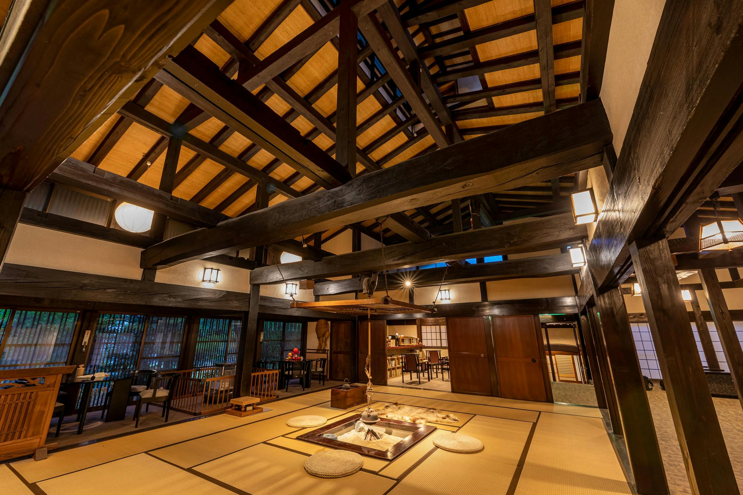 高い天井と重厚な梁を設えたロビーに、コーヒーを飲んだりできる囲炉裏のある宿です。