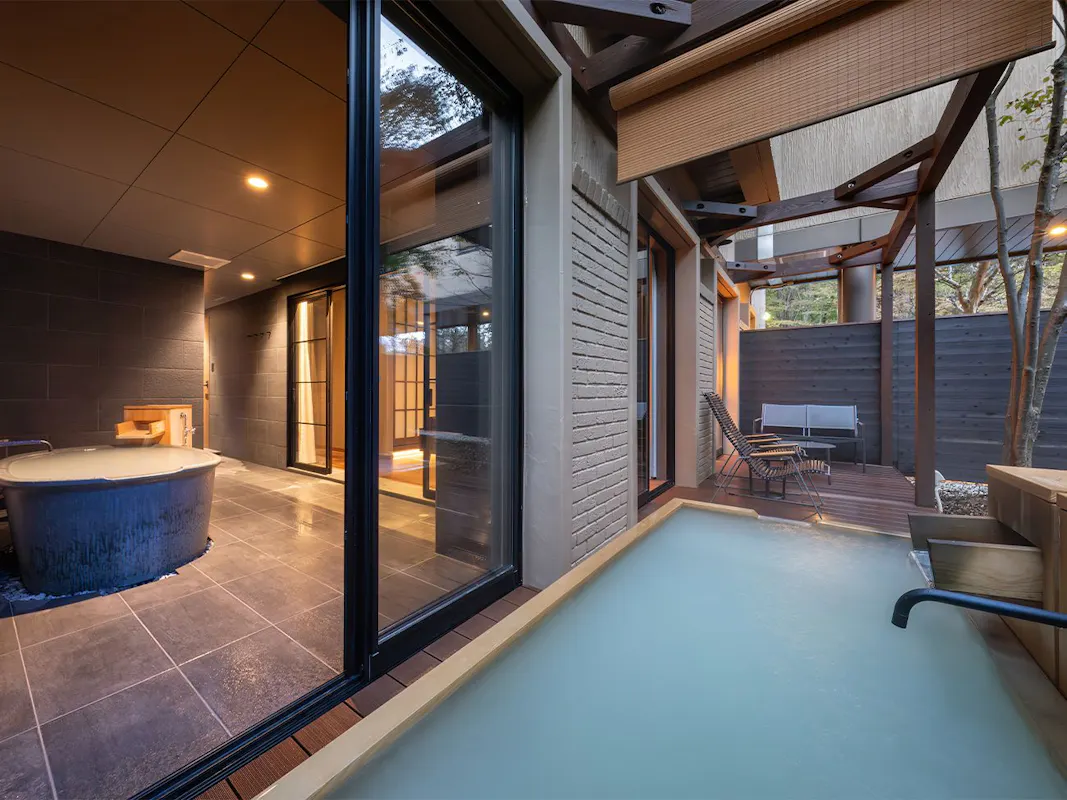 那須の四季を眺められる、全室半露天風呂付きの客室を備えた宿で、一部客室にプライベートサウナを完備。セルフロウリュが楽しめるほか、「森旬の籠スイート」「大瑠璃スイート」などはテラス付きで、外気浴しやすい造りになっています。