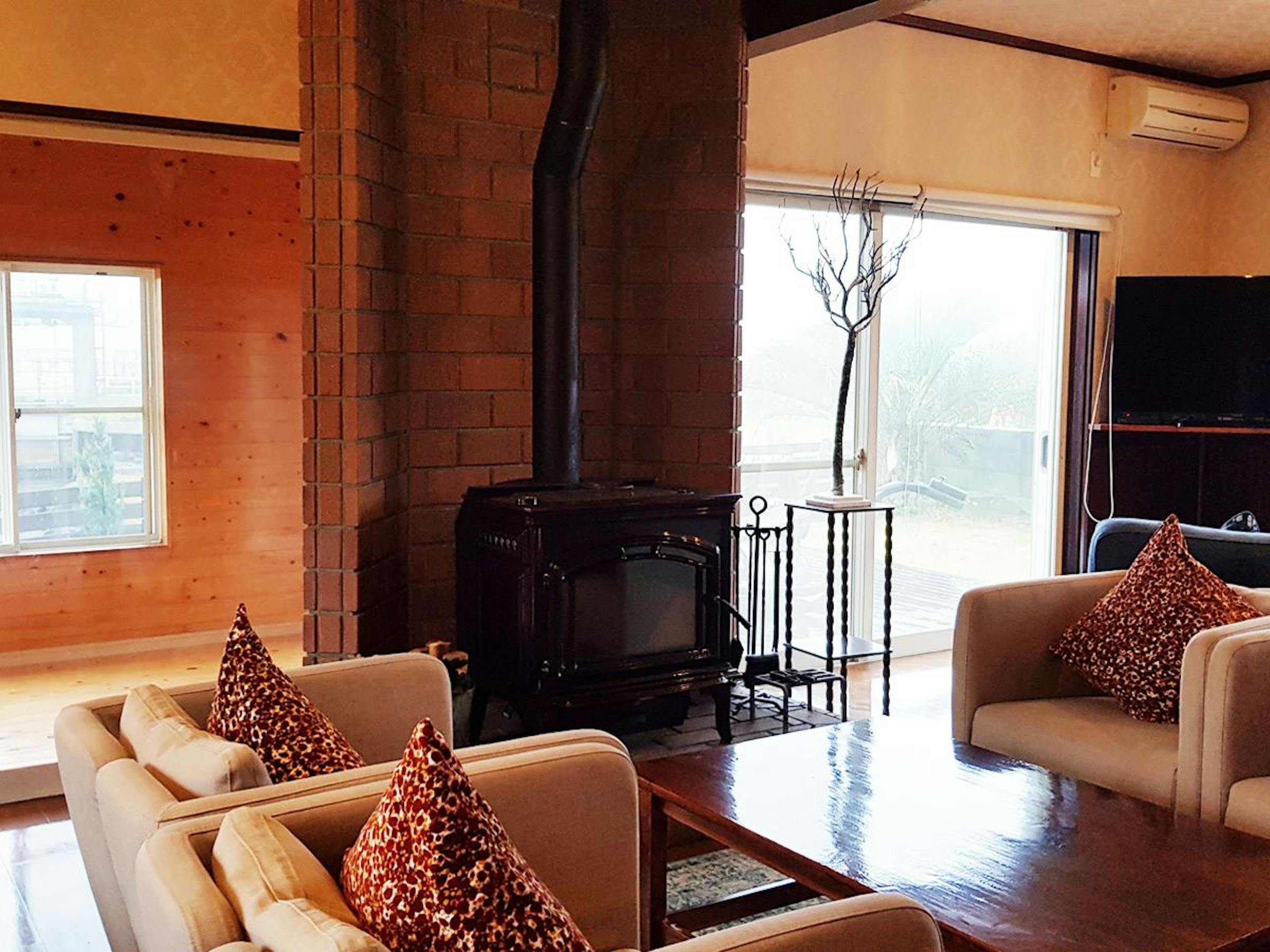 玄関から中に入ると室内に薪ストーブのあるコテージとなり、皆で温かな団欒をして過ごすことができます(薪・着火剤など有料)。