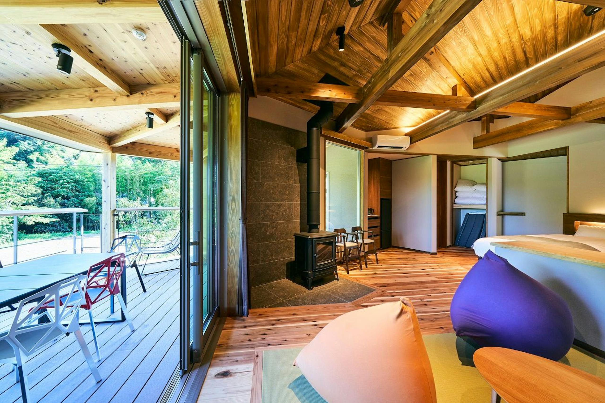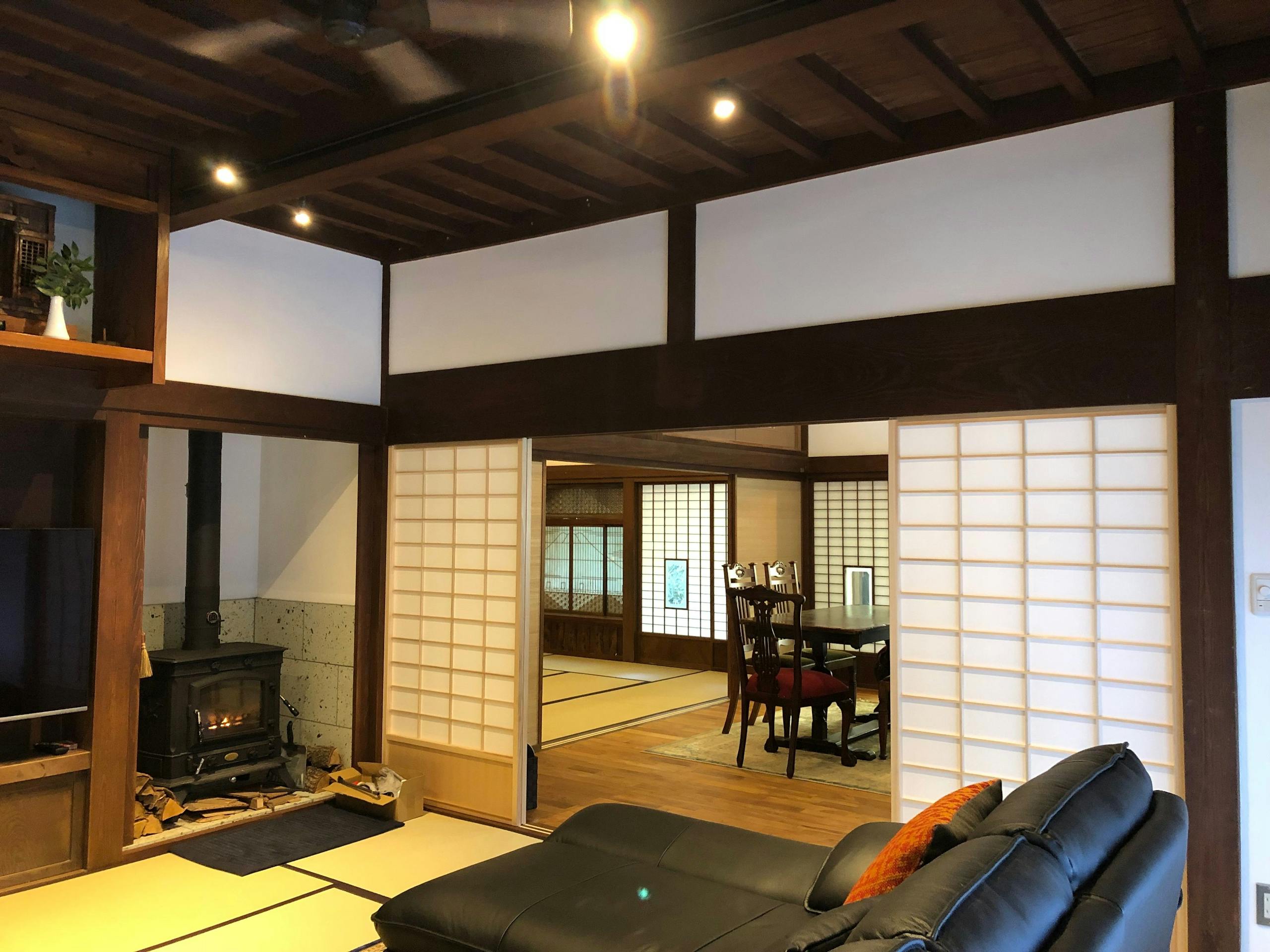 こちらは冬に寒くならないよう最先端の建築によるハイブリッドな古民家となり、リビングには薪による暖炉のある宿となっています(薪代有料)。