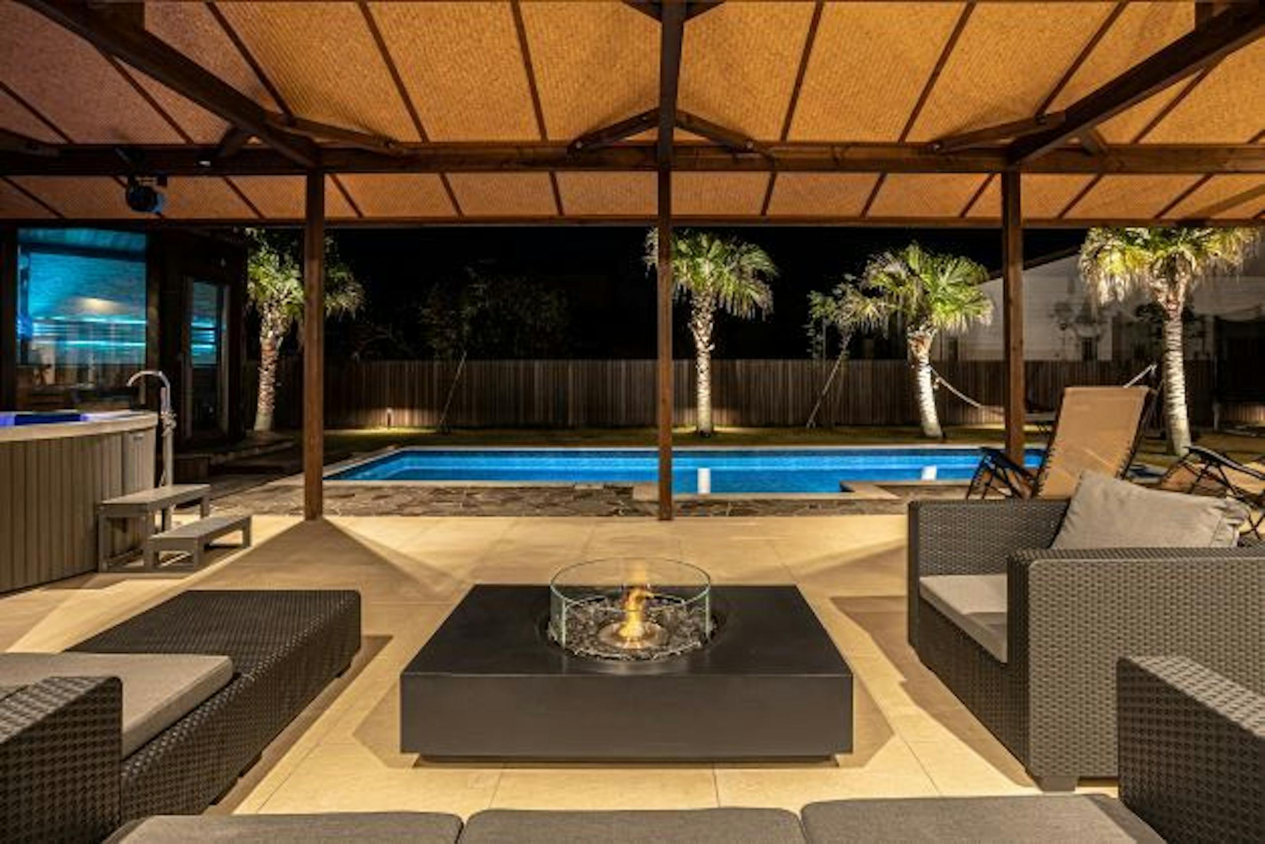 またこちらの広いお庭には温水プールやロウリュウサウナ、ジャグジー、トランポリンなども完備して、屋根付きBBQスペースでバーベキューも楽しめます。