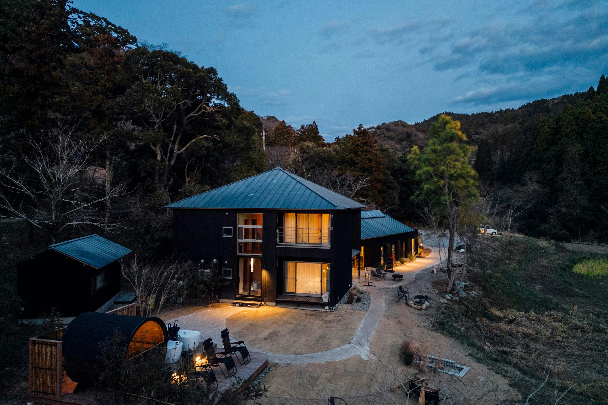 また屋外のロウリュサウナで緑を眺めてととのえたり、夕食には囲炉裏を囲んで串焼きを食したりすることもできます。