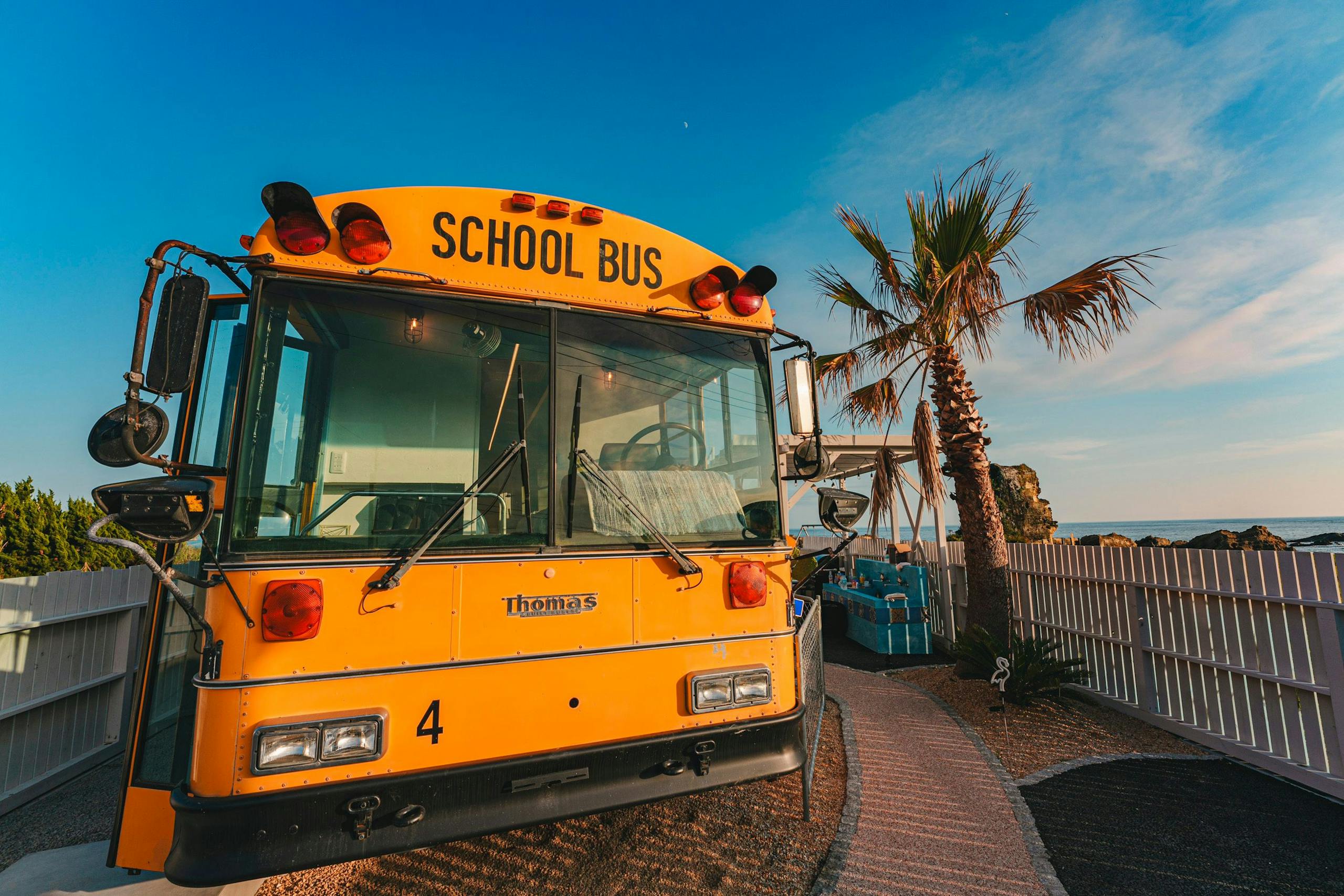 Hotel Ocean BUS Shirahamaは千葉県最南端の白浜にて、磯の海岸近くに佇むアメリカンスクールバスのホテルです。