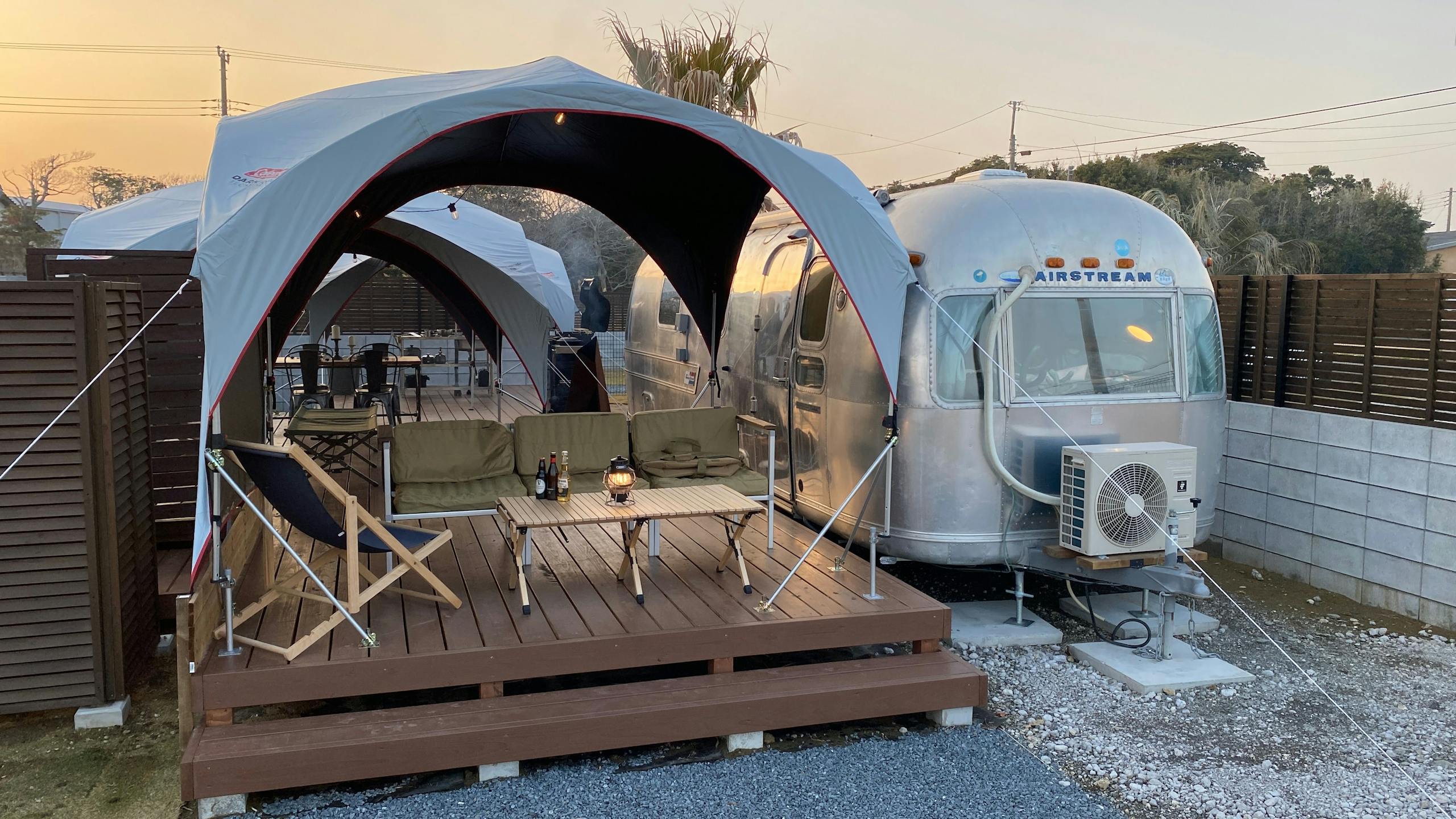 客室であるエアストリームの室外にテントをかけたウッドデッキが常設され、スタイリッシュな焚火台が設置されて焚き火ができるアウトドアリビングとなっています。