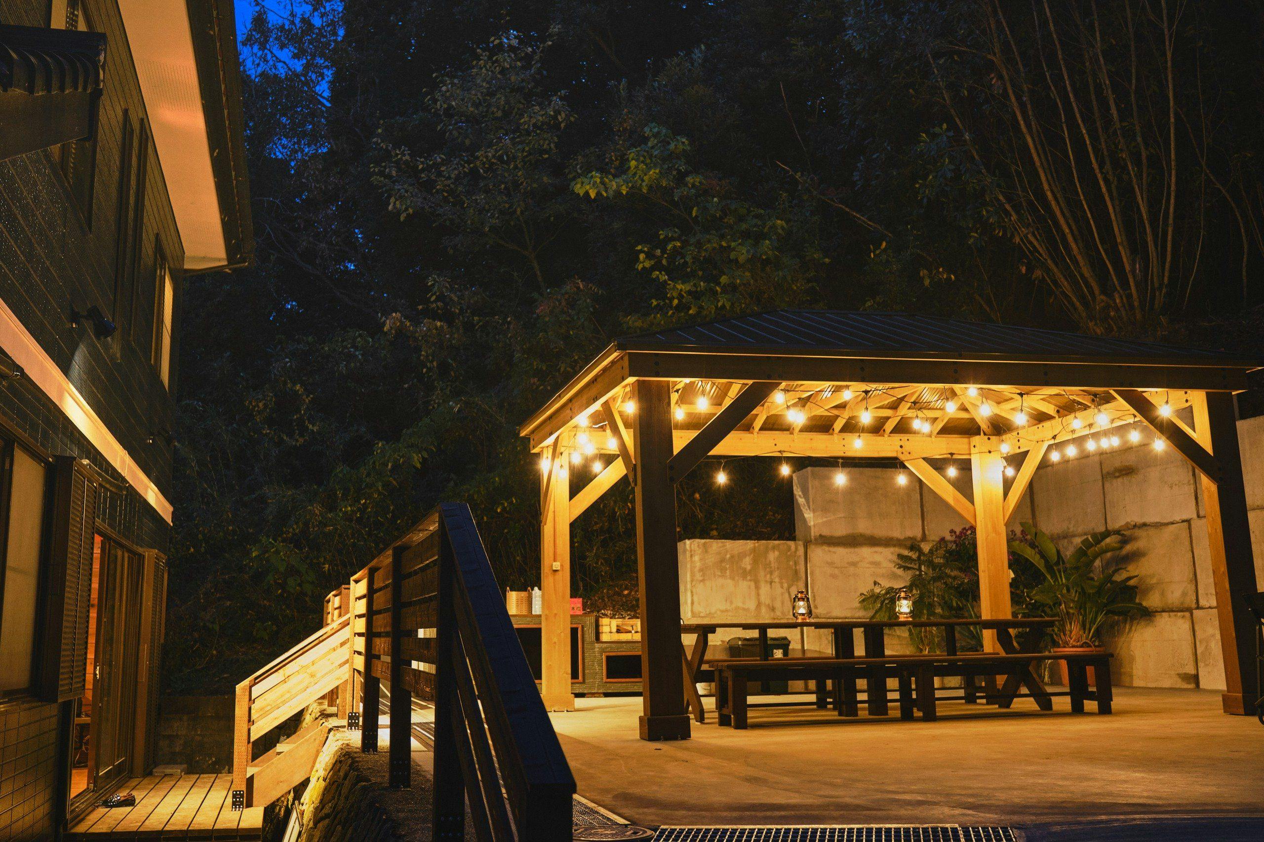グランピングエリアも自由に使える「1棟貸し別荘+グランピングエリア使い放題プラン」にて、オプションの焚火セットを利用してグランピングエリアで焚き火ができる貸別荘となります。