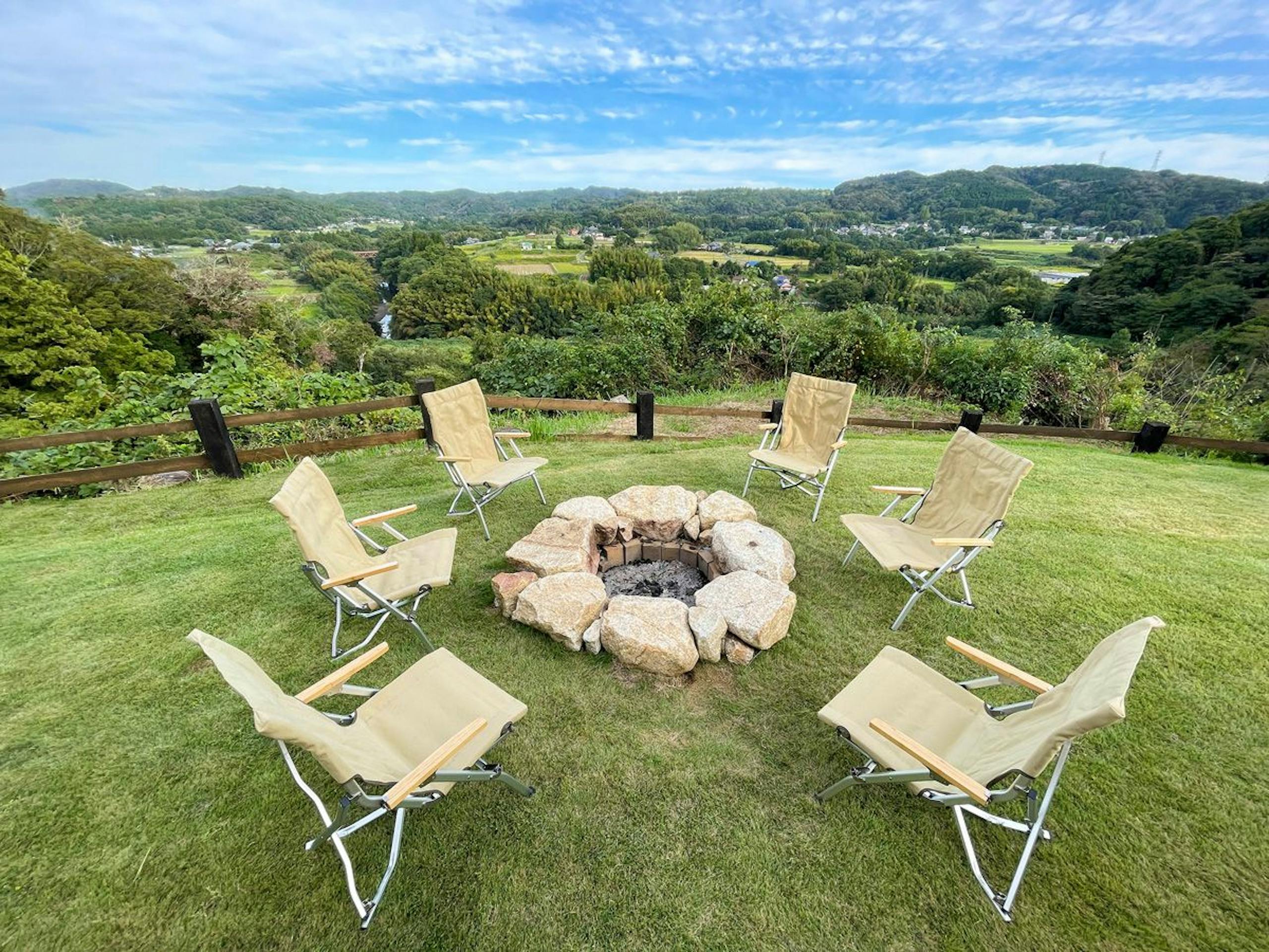 眺望の良いお庭にファイヤーピット(有料)を設えているので、みんなで炎を囲んで焚き火ができる貸別荘となっています。