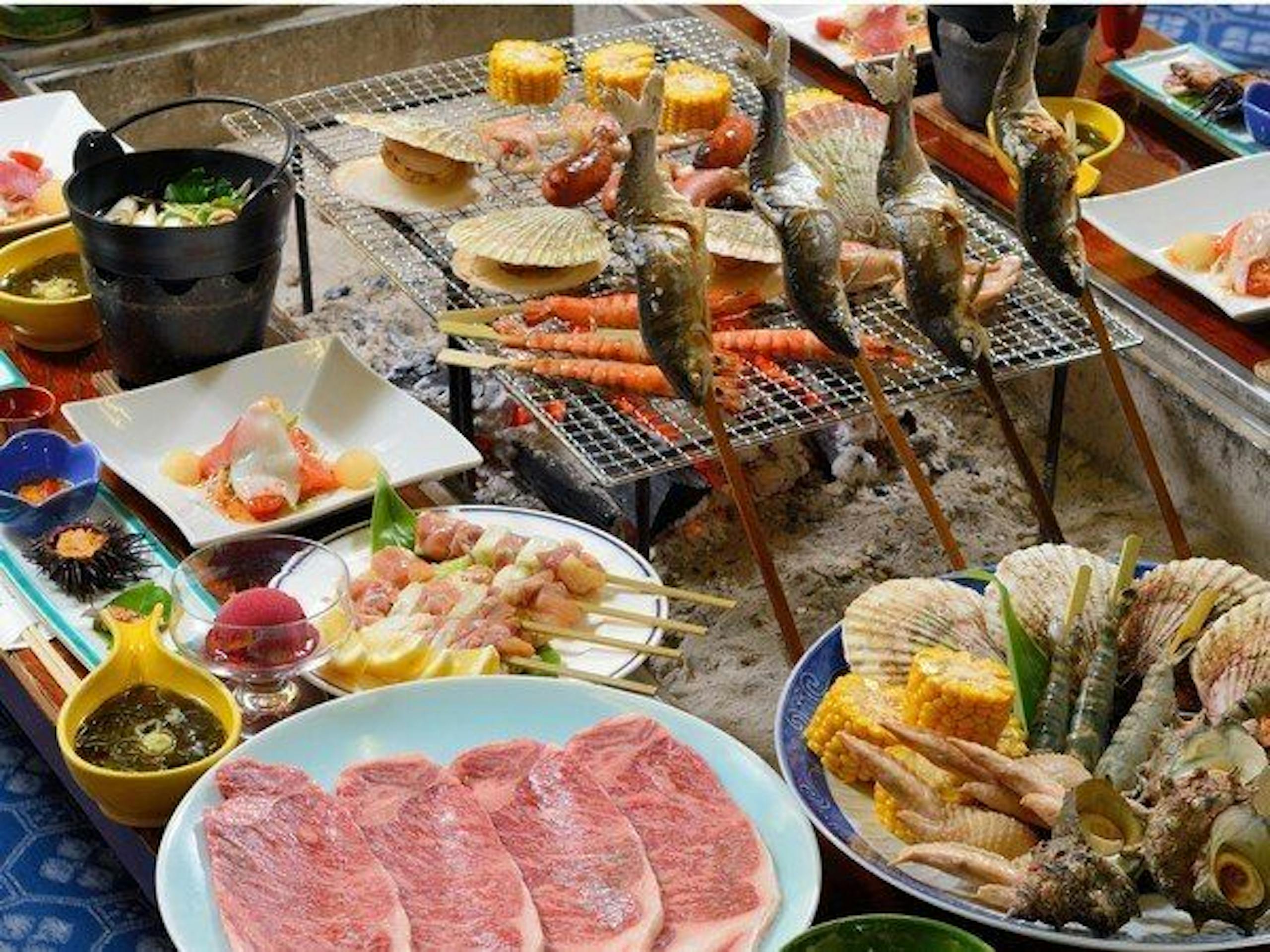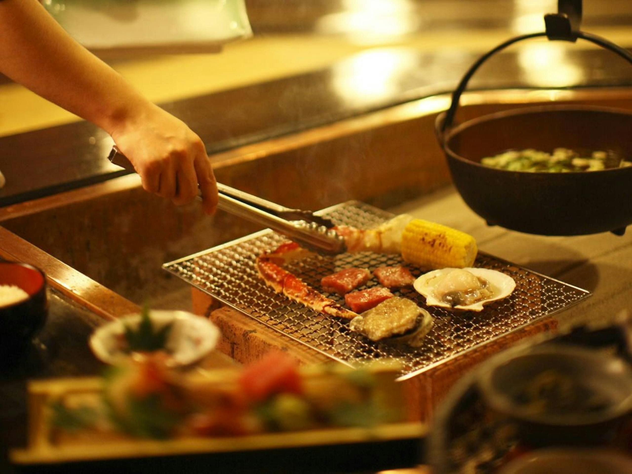 食事処の賑山亭にて日本海や陸奥湾の海の幸、北東北の山の幸など炭火炉端で焼いて食せる、囲炉裏のある宿です(プランによりメニューは変わります)。