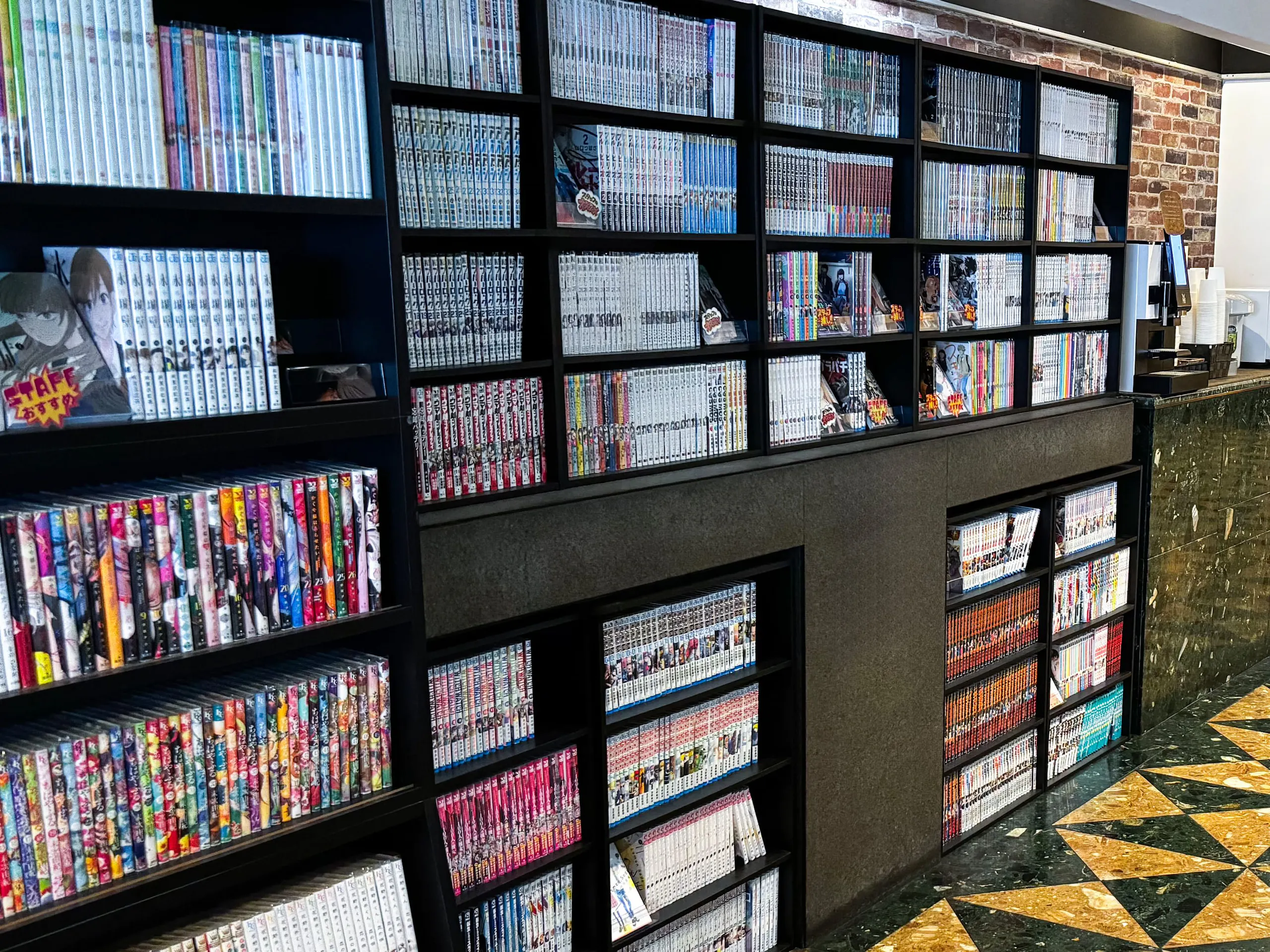 ロビーの「MANGA Library」には約8,000冊の漫画がそろい、最大10冊まで借りて客室で読み放題できます。名作から最新作まで幅広く取り扱いがあり、ラインナップも定期的に入れ替え。