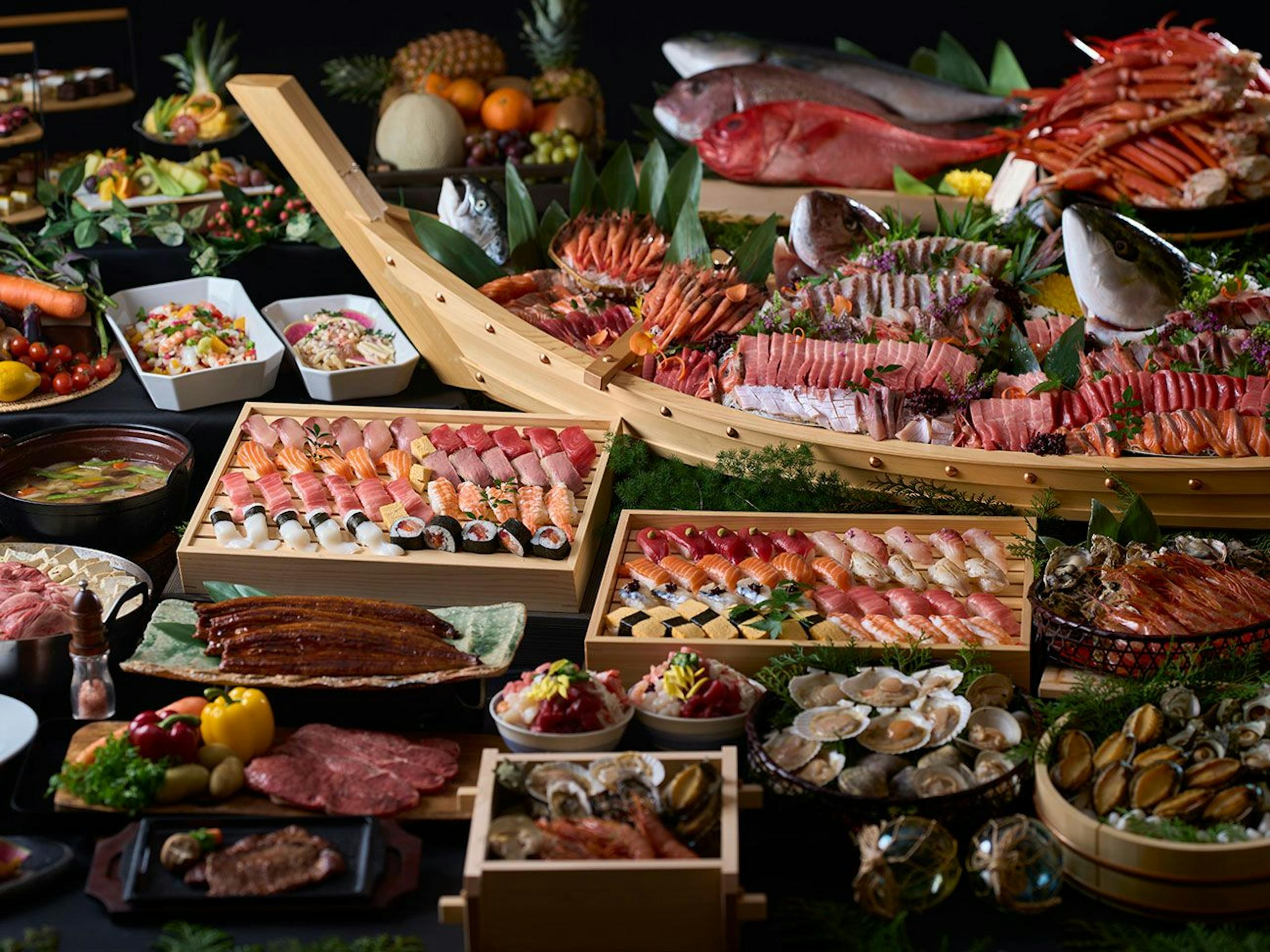 市場直送の鮮魚や黒毛和牛など、豪華食材のバイキングを堪能できる。